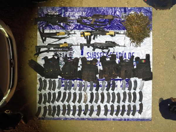 Al realizar la inspección correspondiente, se aseguró que los sujetos portaban 6 armas de fuego largas, mil 770 cartuchos útiles, 60 cargadores y 6 chalecos tácticos.