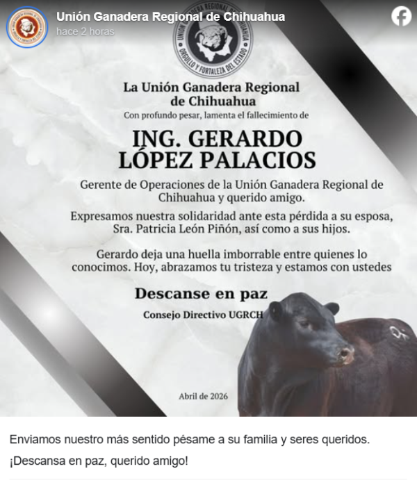 La Unión Ganadera Regional de Chihuahua (UGRCh) confirmó que López Palacios se desempeñó como Gerente de Operaciones del organismo, destacando su trayectoria y cercanía con el sector.