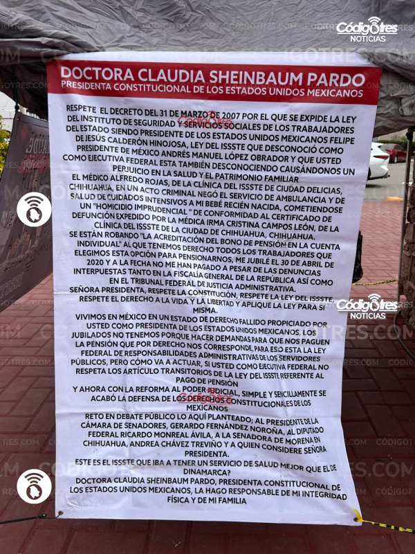 Delicias. - Martín Zapata, maestro jubilado decidió manifestarse frente a la Presidencia de Delicias para retomar su lucha personal sobre la falta de su pago de jubilación porque en el 2006 decidió una modalidad que actualmente no es reconocida por la presidenta de la República Mexicana, Claudia Sheinbaum.