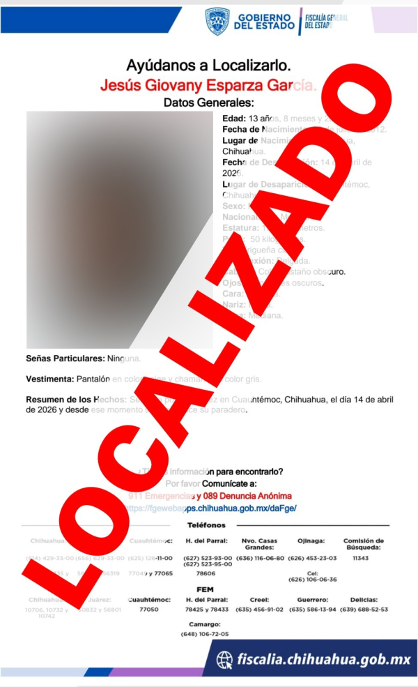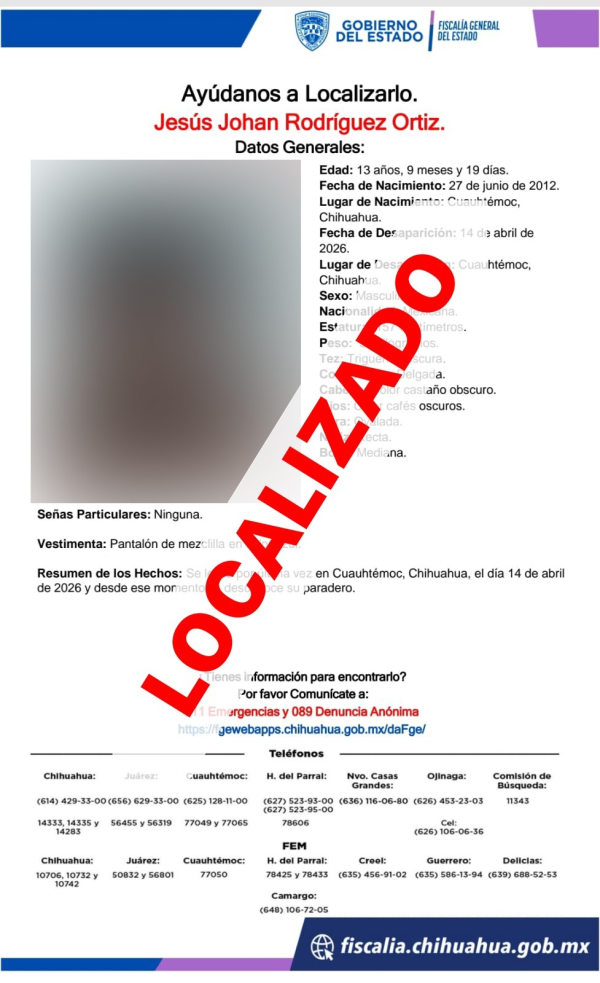 La Fiscalía de Distrito Zona Occidente, localizó sanos y salvos a seis menores de edad, quienes el pasado martes 14 de abril se salieron sin autorización de un albergue de la ciudad de Cuauhtémoc, por lo que fue reportada su ausencia.
