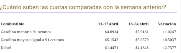 DescuentosEl descuento para diésel queda a partir de hoy en 43.17% de la cuota de IEPS; para gasolina "verde" 11.67%; y en la "roja" es del 0%.Esto significa que la gasolina de alto octanaje vuelve a tener la máxima cuota posible de IEPS.En tanto que el diésel pagará el doble de impuesto comparado con la semana anterior.La gasolina "verde" de bajo octanaje está cerca de volver a la máxima cuota.Esto podría tener que ver con el hecho de que han bajado los precios internacionales del petróleo al reducirse la tensión en la guerra de Estados Unidos contra Irán.Esto pagarás de IEPS del 18 al 24 de abril:Gasolina menor a 91 octanos (verde, magna, regular).......$5.9181.Gasolina mayor o igual a 91 octanos (roja, premium)........$5.6579.Diésel.................................................................................$4.1848.