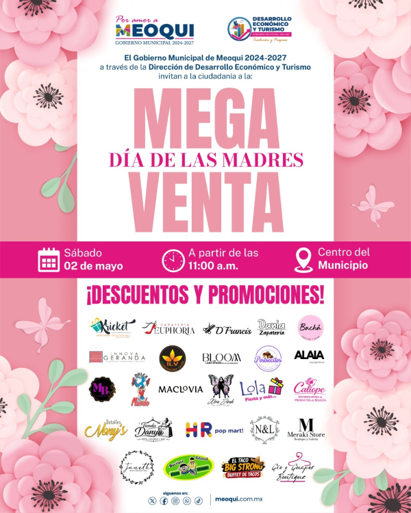 El Gobierno Municipal de Meoqui, a través de la Dirección de Desarrollo Económico y Turismo, invita a la ciudadanía a asistir a la Mega Venta del Día de las Madres, que se llevará a cabo el próximo sábado 2 de mayo a partir de las 11:00 de la mañana en la zona centro del municipio, donde además se instalará la Feria Regional de Emprendedores.