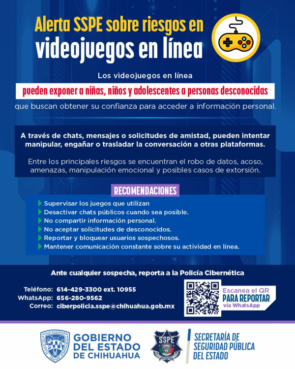 La Secretaría de Seguridad Pública del Estado (SSPE) alerta a madres, padres y tutores sobre los riesgos asociados al uso de videojuegos en línea, donde personas desconocidas pueden interactuar con niñas, niños y adolescentes mediante chats de voz, mensajes y solicitudes de amistad