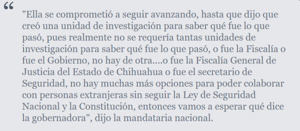 La mandataria nacional asegura que no se requería hacer una unidad de investigación, como lo hizo la gobernadora Maru Campos
