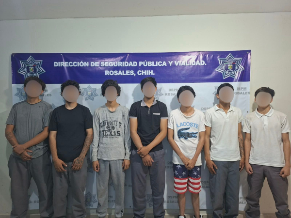Rosales, Chih.- Siete jóvenes, entre ellos cinco menores de edad, fueron detenidos por elementos de Seguridad Pública Municipal luego de ser sorprendidos presuntamente intoxicándose en la vía pública, en hechos ocurridos en la zona centro del municipio.